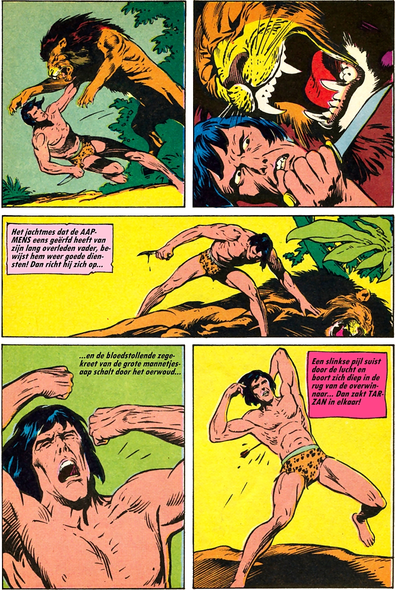 Het jachtmes dat de AAPMENS eens geërfd heeft van zijn lang overleden vader, bewijst hem weer goede diensten! Dan richt hij zich op... ...en de bloedstollende zegekreet van de grote mannetjesaap schalt door het oerwoud... Een slinkse pijl suist door de lucht en boort zich diep in de rug van de overwinnaar... Dan zakt TARZAN in elkaar! |