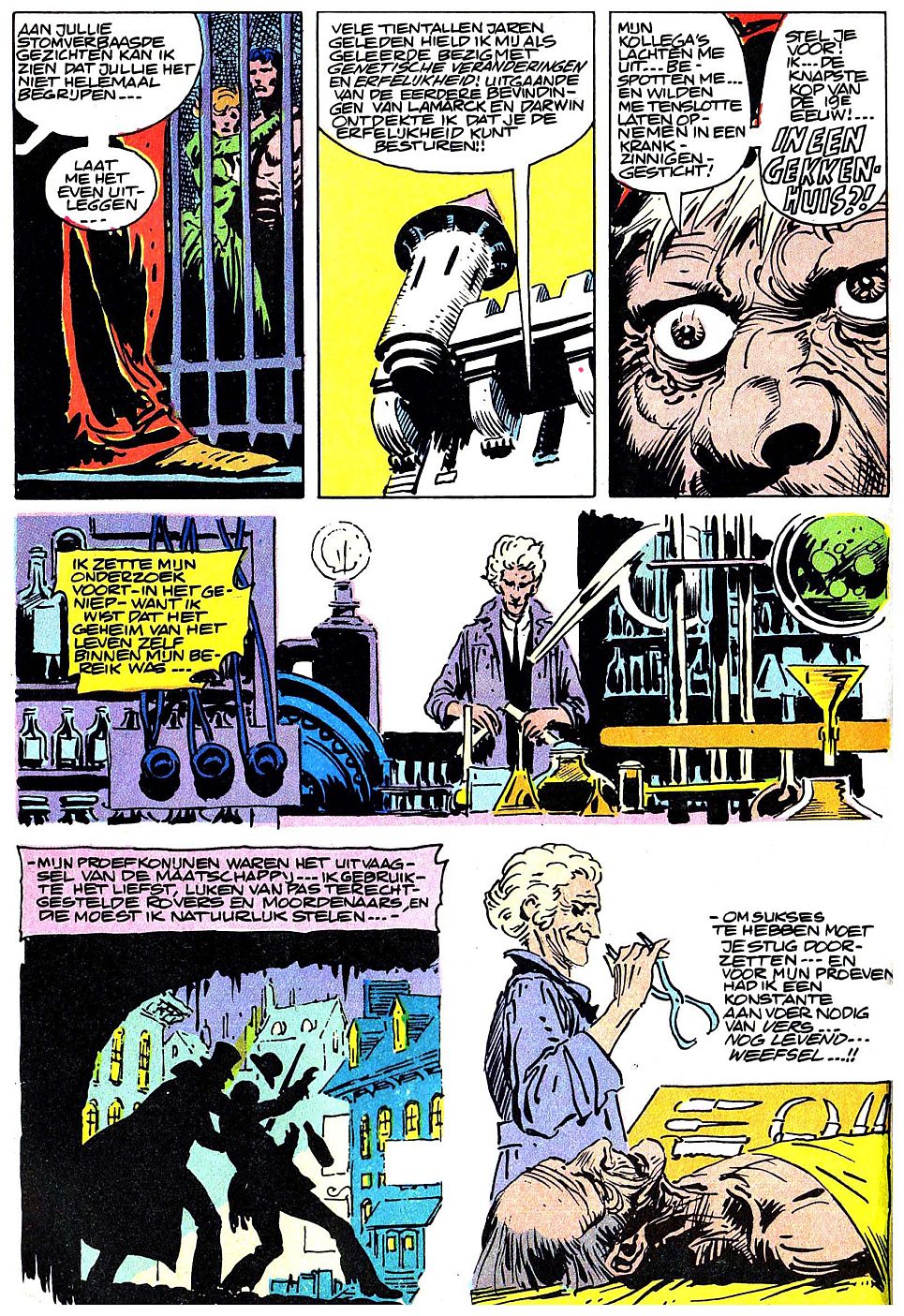 HELEMAAL BEGRIJPEN... LAAT MET HET EVEN UITLEGGEN... VELE TIENTALLEN JAREN GELEDEN HIELD IK MIJ ALS GELEERDE BEZIG MET GENETISCHE VERANDERINGEN EN ERFELIJKHEID! UITGAANDE VAN DE EERDERE BEVINDINGEN VAN LAMARCK EN DARWIN ONTDEKTE IK DAT JE DE ERFELIJKHEID KUNT BESTUREN! MIJN KOLLEGA'S LACHTEN ME UIT... BESPOTTEN ME... EN WILDEN ME TENSLOTTE LATEN OPNEMEN IN EEN KRANKZINNIGENGESTICHT! STEL JE VOOR! IK... DE KNAPSTE KOP VAN DE 19E EEUW!... IN EEN GEKKENHUIS?! IK ZETTE MIJN ONDERZOEK VOORT - IN HET GENIEP - WANT IK WIST DAT HET GEHEIM VAN HET LEVEN ZELF BINNEN MIJN BEREIK WAS... - MIJN PROEFKONIJNEN WAREN HET UITVAAGSEL VAN DE MAATSCHAPPIJ... IK GEBRUIKTE HET LIEFST LIJKEN VAN PAS TERECHTGESTELDE ROVERS EN MOORDENAARS, EN DIE MOEST IK NATUURLIJK STELEN...- - OM SUKSES TE HEBBEN MOET JE STUG DOORZETTEN... EN VOOR MIJN PROEVEN HAD IK EEN KONSTANTE AANVOER NODIG VAN VERS... NOG LEVEND... WEEFSEL...!! |