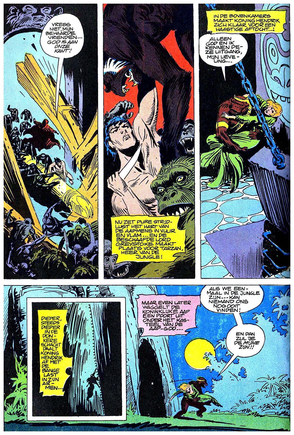 BEHAARDE VRIENDEN... GOD IS AAN ONZE KANT! NU ZET PURE STRIJDLUST HET HART VAN DE AAPMENS IN VUUR EN VLAM... EN DE BESCHAAFDE LORD GREYSTOKE MAAKT PLAATS VOOR TARZAN, HEER VAN DE JUNGLE! IN DE BOVENKAMERS MAAKT KONING HENDRIK ZICH KLAAR VOOR EEN HAASTIGE AFTOCHT...! ALLEEN GOD EN IK KENNEN DEZE UITGANG, MIJN LIEVELING... DIEPER, STEEDS DIEPER IN DE DONKERE SCHACHT DAALT KONING HENDRIK AF MET DE BANGE LAST IN ZIJN ARMEN... MAAR EVEN LATER WAGGELT DE KONINKLIJKE AAP EEN POORT UIT ONDER HET KASTEEL VAN DE AAP-GOD... ALS WE EENMAAL IN DE JUNGLE ZIJN... KAN NIEMAND ONS NOG OOIT VINDEN! EN DAN ZUL JE DE MIJNE ZIJN!!! |