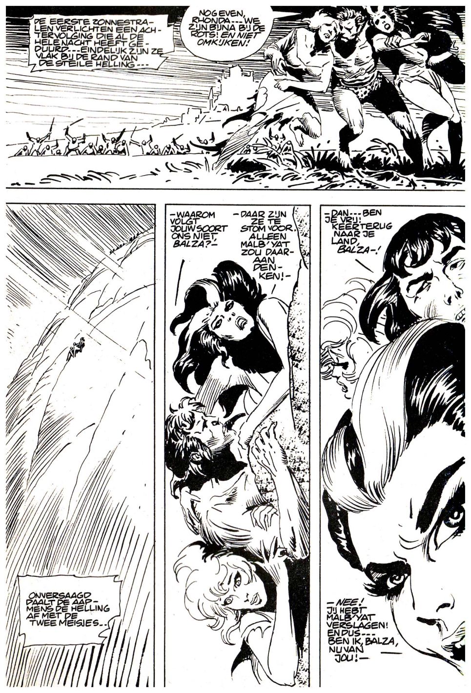 STEILE HELLING... NOG EVEN RHONDA... WE ZIJN BIJNA BIJ DE ROTS! EN NIET OMKIJKEN! ONVERSAAGD DAALT DE AAPMENS DE HELLING AF MET DE TWEE MEISJES... - WAAROM VOLGT JOUW SOORT ONS NIET, BALZA? - - DAAR ZIJN ZE TE STOM VOOR. ALLEEN MALB'YAT ZOU DAARAAN DENKEN! - - DAN... BEN JE VRIJ! KEER TERUG NAAR JE LAND, BALZA - ! - NEE! JIJ HEBT MALB'YAT VERSLAGEN! EN DUS... BEN IK, BALZA, NU VAN JOU! - |