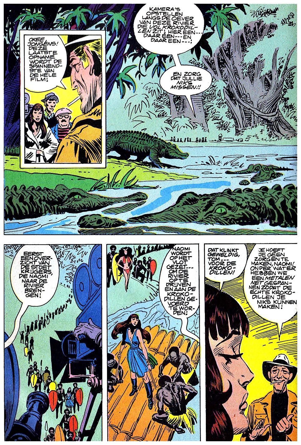FILM! KAMERA'S OPSTELLEN LANGS DE OEVER VAN DEZE RIVIER DIE VOL KROKODILLEN ZIT! HIER EEN... DAAR EEN... EN DAAR EEN...! EN ZORG DAT JULLIE NIKS MISSEN!! EERST EEN OVERZICHT VAN DE STOET KRIJGERS, DIE NAOMI NAAR DE RIVIER BRENGEN! NAOMI WORDT OP HET VLOT GEZET... OM DE RIVIER OP TE DRIJVEN EN AAN DE KROKODILLEN GEVOERD TE WORDEN! DAT KLINKT GEWELDIG, TOM... VOOR DE KROKODILLEN! JE HOEFT JE GEEN ZORGEN TE MAKEN, NAOMI! ONDER WATER HEBBEN WE EEN METALEN NET GESPANNEN ZODAT DE ECHTE KROKODILLEN JE NIKS KUNNEN MAKEN! |