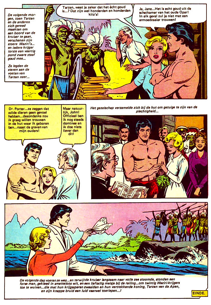 voeten van Tarzan neer... Tarzan, weet je zeker dat het ècht goud is...? Dat zijn wel honderden en honderden kilo's! Ja, Jane... Het is echt goud uit de schatkamer van het oude Opar! In elk geval zul je niet met een armoedzaaier trouwen! Dr. Porter... ze zeggen dat wilde dieren geen gevoel hebben... desondanks zou ik graag willen trouwen in de hut waar ik geboren ben... naast de graven van mijn ouders! Maar natuurlijk, John! Officieel ben ik nog steeds dominee en ik doe niets liever dan dit! Het gezelschap verzamelde zich bij de hut om getuige te zijn van de plechtigheid... De volgende dag voeren ze weg... en terwijl de kruiser langzaam naar volle zee stoomde, stonden een forse man, gekleed in smetteloos wit, en een lieftallig meisje bij de railing... om twintig Waziri-krijgers toe te wuiven... die met hun krijgssperen zwaaiden en hun vertrekkende koning, Tarzan van de Apen, en zijn knappe bruid een luid vaarwel toeriepen...! EINDE. |