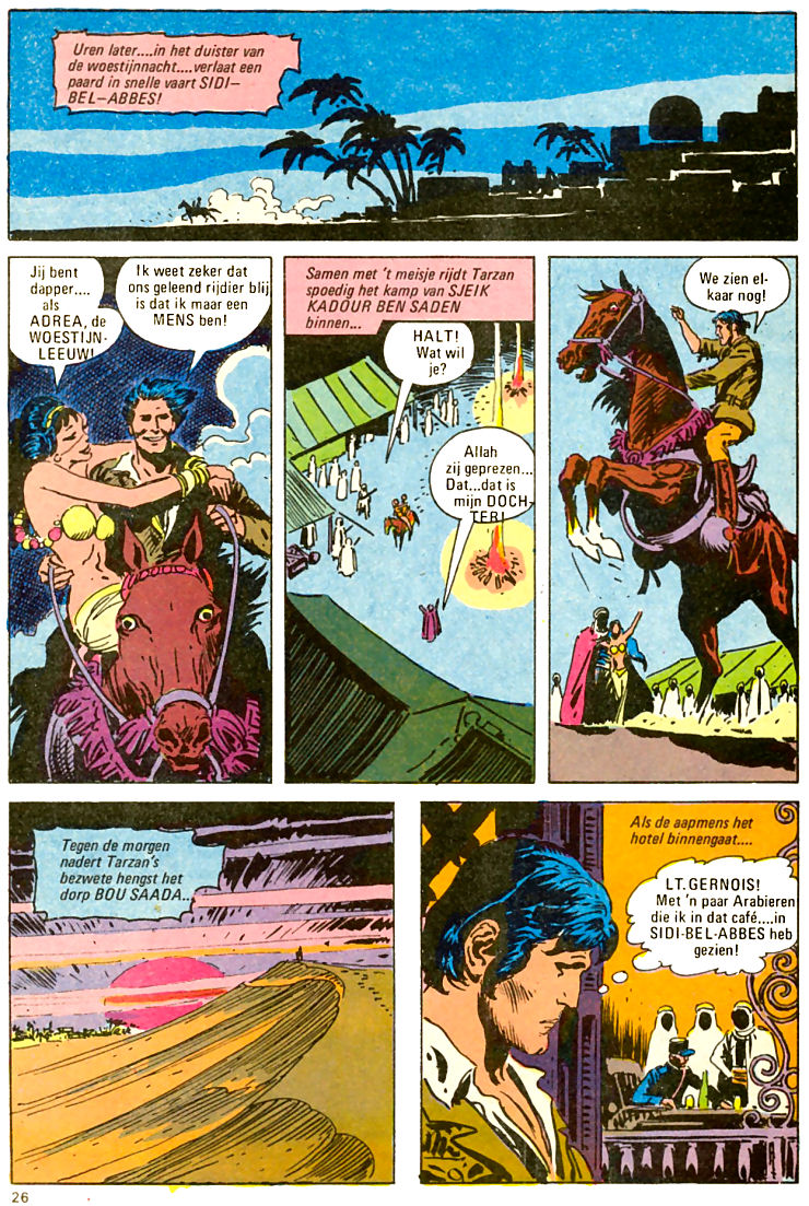 snelle vaart SIDI-BEL-ABBES! Jij bent dapper.... als ADREA, de WOESTIJNLEEUW! Ik weet zeker dat ons geleend rijdier blij is dat ik maar een MENS ben! Samen met 't meisje rijdt Tarzan spoedig het kamp van SJEIK KADOUR BEN SADEN binnen... HALT! Wat wil je? Allah zij geprezen... Dat... dat is mijn DOCHTER! We zien elkaar nog! Tegen de morgen nadert Tarzan's bezwete hengst het dorp BOU SAADA... Als de aapmens het hotel binnengaat.... LT.GERNOIS! Met 'n paar Arabieren die ik in dat café.... in SIDI-BEL-ABBES heb gezien! |