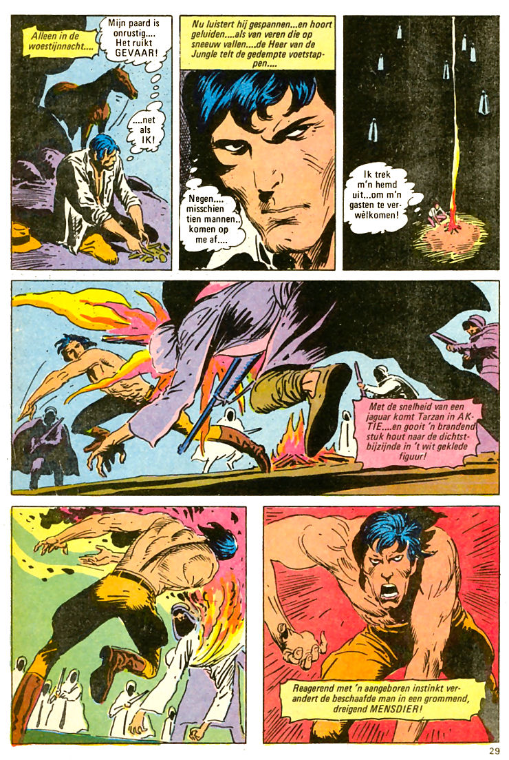 woestijnnacht.... Mijn paard is onrustig.... Het ruikt GEVAAR! ...net als IK! Nu luistert hij gespannen... en hoort geluiden.... als van veren die op sneeuw vallen.... de Heer van de Jungle telt de gedempte voetstappen.... Negen.... misschien tien mannen.. komen op me af.... Ik trek m'n hemd uit... om m'n gasten te verwèlkomen! Met de snelheid van een jaguar komt Tarzan in AKTIE.... en gooit 'n brandend stuk hout naar de dichtstbijzijnde in 't wit geklede figuur! Reagerend met 'n aangeboren instinkt verandert de beschaafde man in een grommend, dreigend MENSDIER! |