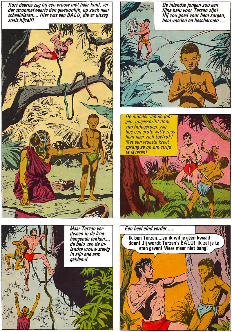 De inlandse jongen zou een fijne balu voor Tarzan zijn! Hij zou goed voor hem zorgen, hem voeden en beschermen.... De moeder van de jongen, opgeschrikt door zijn hulpgeroep, zag hoe een grote witte reus hem naar zich toetrok! Met een woeste kreet sprong ze op om strijd te leveren! Maar Tarzan verdween in de laaghangende takken.... de balu van de inlandse vrouw stevig in zijn ene arm geklemd. Een heel eind verder..... Ik ben Tarzan.... en ik wil je geen kwaad doen! Jij wordt Tarzan's BALU! Ik zal je te eten geven! Wees maar niet bang! |