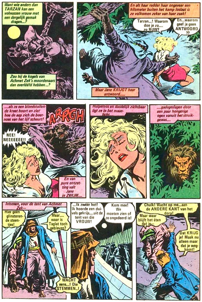 Zou hij de kogels van Achmet Zek's moordenaars dan overlééfd hebben...? En als haar redder haar ongeveer een kilometer buiten het kamp loslaat is ze volkomen zeker van haar zaak! Tarzan...! Waarom doe je zo.... zo RUW? En... waarom geef je geen ANTWOORD?? Maar Jane KRIJGT haar antwoord.... ....als ze een bloedstollende kreet hoort en ziet hoe de aap zich de boernoes van het lijf scheurt! ARRGH NEE! NEEEEEEE!! En van pure ontzetting valt Jane in ZWIJM.... Hulpeloos en duidelijk zichtbaar ligt ze in het maanlicht.... ....gadegeslagen door een paar hongerige ogen vanuit het struikgewas.... Intussen, voor de tent van Achmet Zek... Hier geen glinsterende steentjes! Maar.... waar is Taglat toch gebleven? WACHT eens...! Die STEMMEN..! ...Ik zwéér het! Ik hoorde een duivels gekrijs.... uit de tent van die VROUW! Kom mee! We moeten zien of ze ongedeerd is! Chulk! Wacht op me... aan de ANDERE KANT van het dorp! Maar waar blijft het éten dat je... Dat KRIJG je! Maak nu alleen maar dat je wegkomt! |