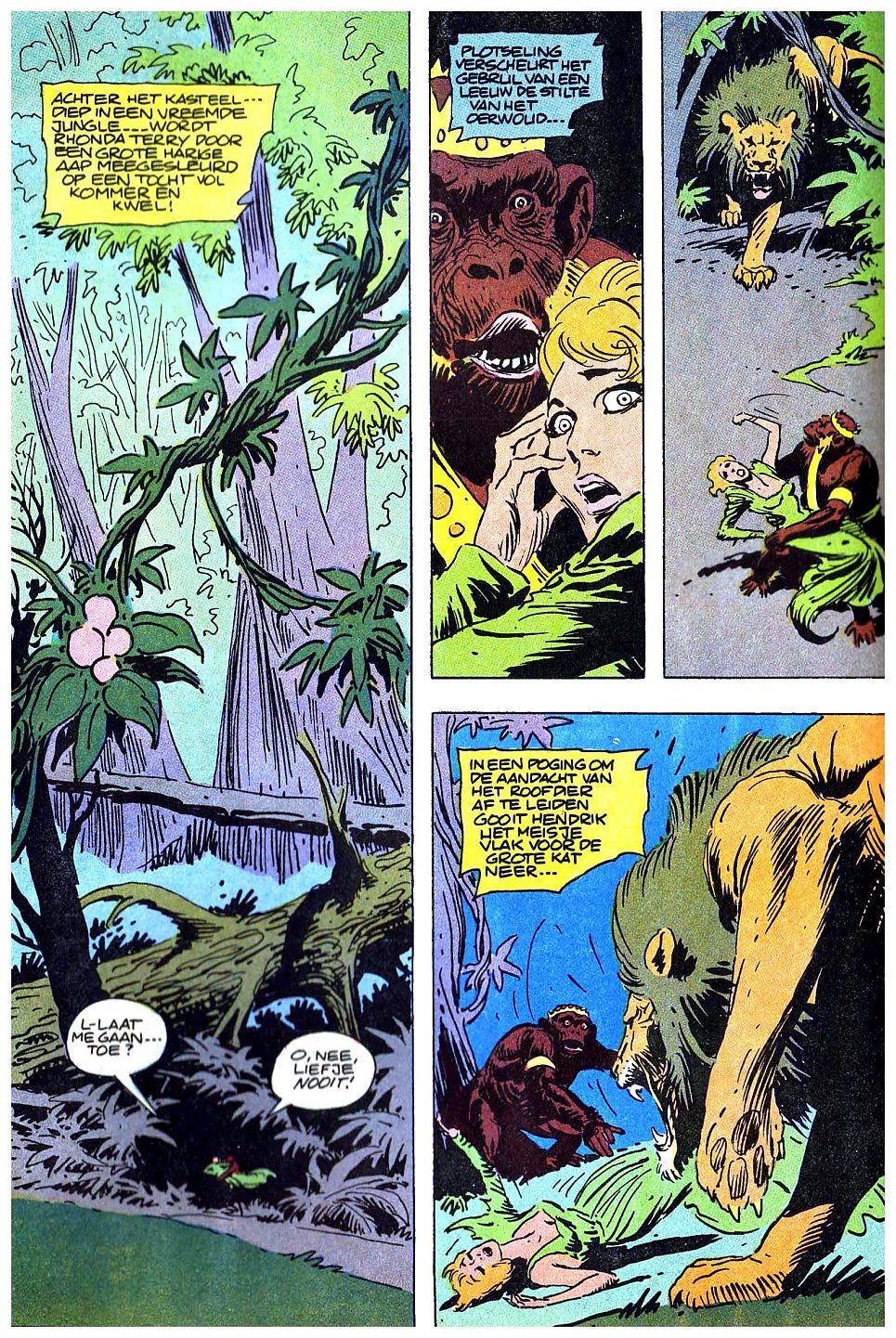 EN KWEL! L-LAAT ME GAAN... TOE? O, NEE, LIEFJE NOOIT! PLOTSELING VERSCHEURT HET GEBRUL VAN EEN LEEUW DE STILTE VAN HET OERWOUD... IN EEN POGING OM DE AANDACHT VAN HET ROOFDIER AF TE LEIDEN GOOIT HENDRIK HET MEISJE VLAK VOOR DE GROTE KAT NEER... |