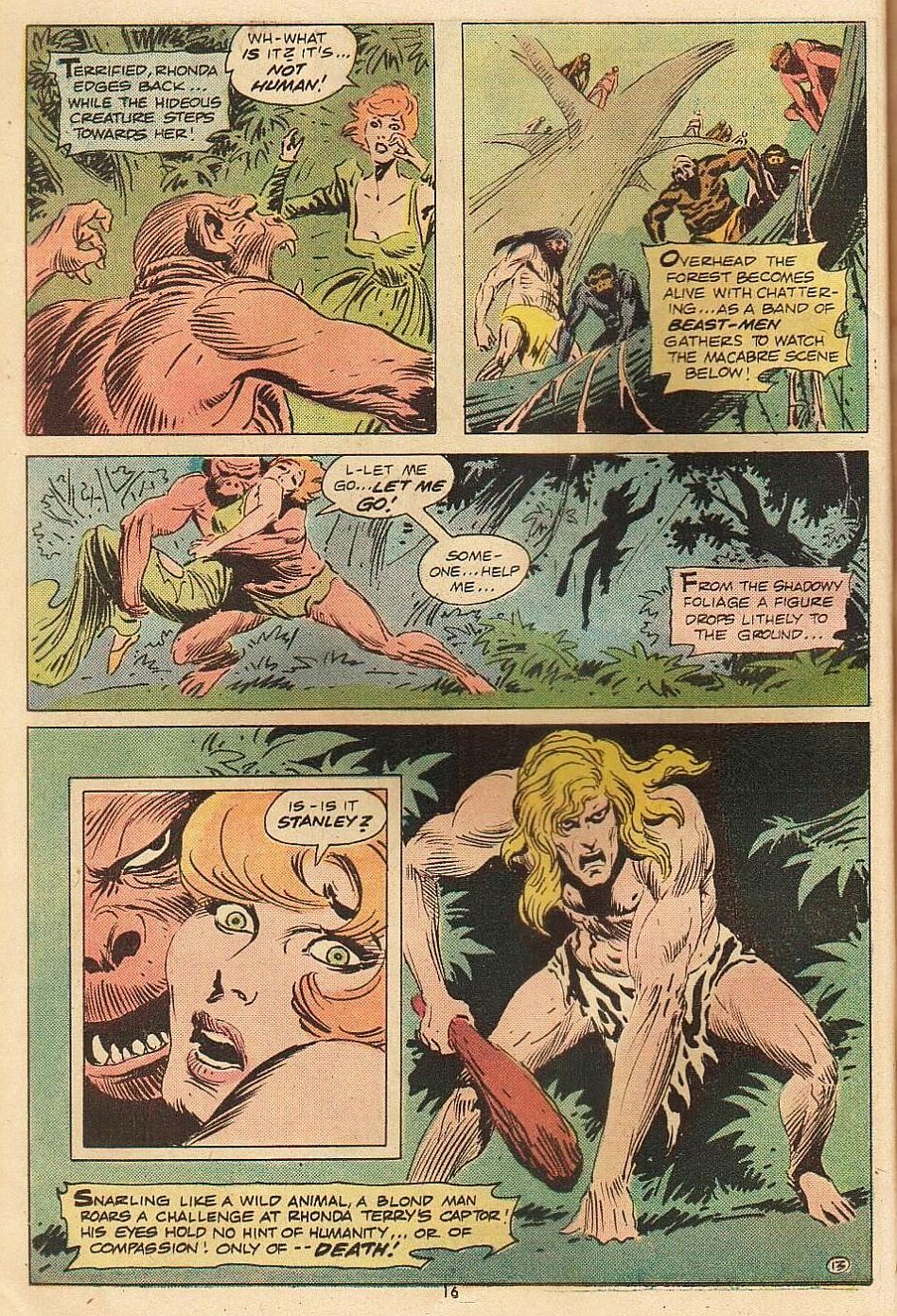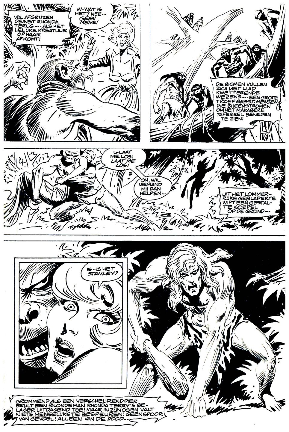 RHONDA TERUG.. ALS HET LELIJKE KREATUUR OP HAAR AFKOMT! W-WAT IS HET? NEE.. GEEN MENS! DE BOMEN VULLEN ZICH MET LUID KWETTERENDE WEZENS... EEN GROTE TROEP BEEST-MENSEN DIE BIJEENSTROMEN OM HET MAKABERE TAFEREEL BENEDEN TE ZIEN! L-LAAT ME LOS! LAAT ME LOS! OH, WIL NIEMAND MIJ DAN HELPEN... UIT HET LOMMERRIJKE GEBLADERTE WIPT EEN GESTALTE SOEPEL OP DE GROND... IS-IS HET STANLEY? GROMMEND ALS EEN VERSCHEUREND DIER BRULT EEN BLONDE MAN RHONDA TERRY'S BELAGER UITDAGEND TOE! MAAR IN ZIJN OGEN VALT NIETS MENSELIJKS TE BESPEUREN! GEEN SPOOR VAN GEVOEL! ALLEEN VAN DE DOOD... |