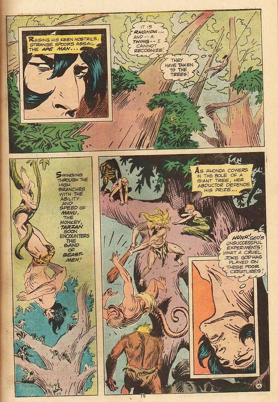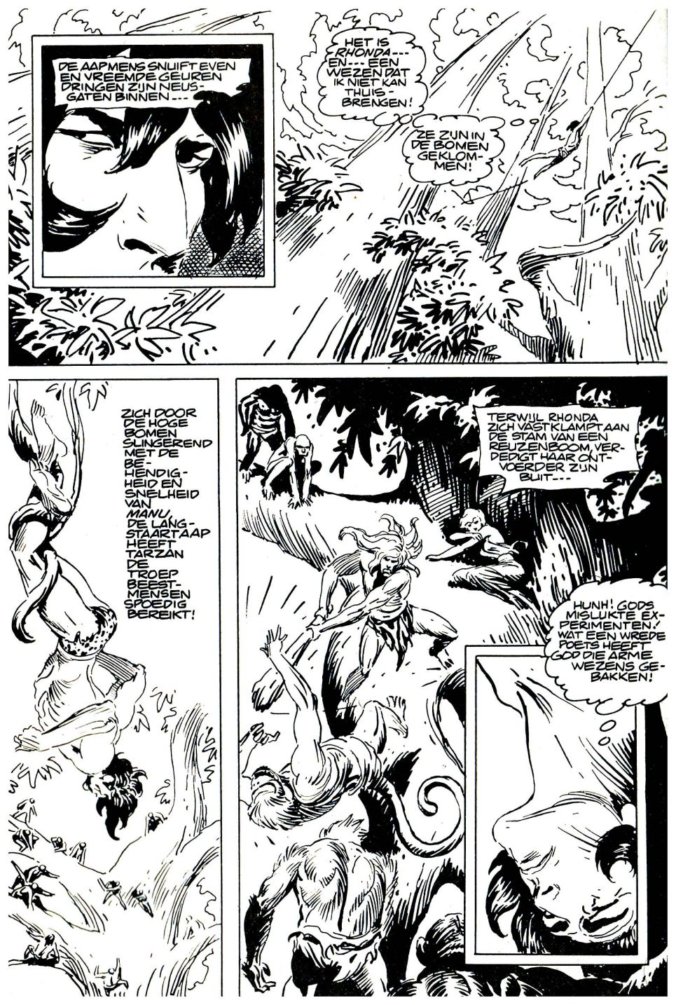 EN VREEMDE GEUREN DRINGEN ZIJN NEUSGATEN BINNEN... HET IS RHONDA... EN... EEN WEZEN DAT IK NIET KAN THUISBRENGEN! ZE ZIJN IN DE BOMEN GEKLOMMEN! ZICH DOOR DE HOGE BOMEN SLINGEREND MET DE BEHENDIGHEID VAN MANU, DE LANGSTAARTAAP HEEFT TARZAN DE TROEP BEESTMENSEN SPOEDIG BEREIKT! TERWIJL RHONDA ZICH VASTKLAMPT AAN DE STAM VAN EEN REUZENBOOM, VERDEDIGT HAAR ONTVOERDER ZIJN BUIT... HUNH! GODS MISLUKTE EXPERIMENTEN! WAT EEN WREDE POETS HEEFT GOD DIE ARME WEZENS GEBAKKEN! |