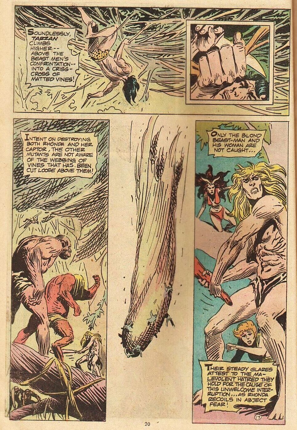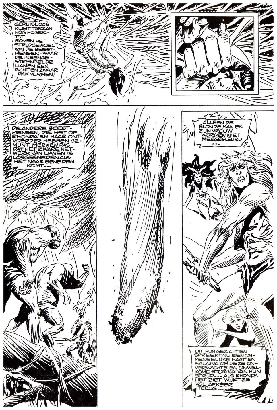EN ZWAAR DAK VORMEN! DE ANDERE BEESTMENSEN, DIE HET OP RHONDA HEBBEN GEMUNT, MERKEN PAS DAT HET ZWARE NETWERK VAN LIANEN IS LOSGESNEDEN ALS HET NAAR BENEDEN KOMT... ALLEEN DE BLONDE MAN EN ZIJN VROUW WORDEN NIET MEEGESLEURD... UIT HUN GEZICHTEN SPREEKT NU EEN ONMENSELIJKE HAAT EN WALGING OM DEZE ONVERWACHTE EN ONWELKOME STORING VAN HUN STRIJD... ALS RHONDA HET ZIET, WIJKT ZE VOL AFKEER TERUG... |