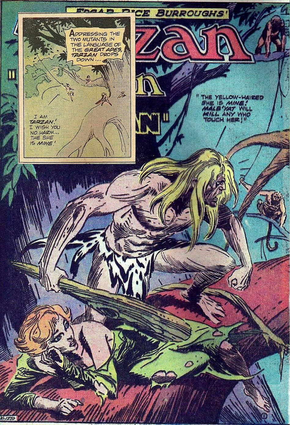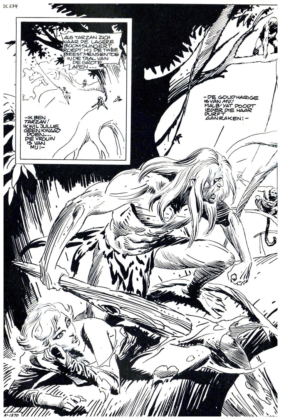 IN DE TAAL VAN DE GROTE APEN... - IK BEN TARZAN! IK WIL JULLIE GEEN KWAAD DOEN... DIE VROUW IS VAN MIJ! - - DE GOUDHARIGE IS VAN MIJ! MALB'YAT DOODT IEDER DIE HAAR DURFT AANRAKEN! - |
