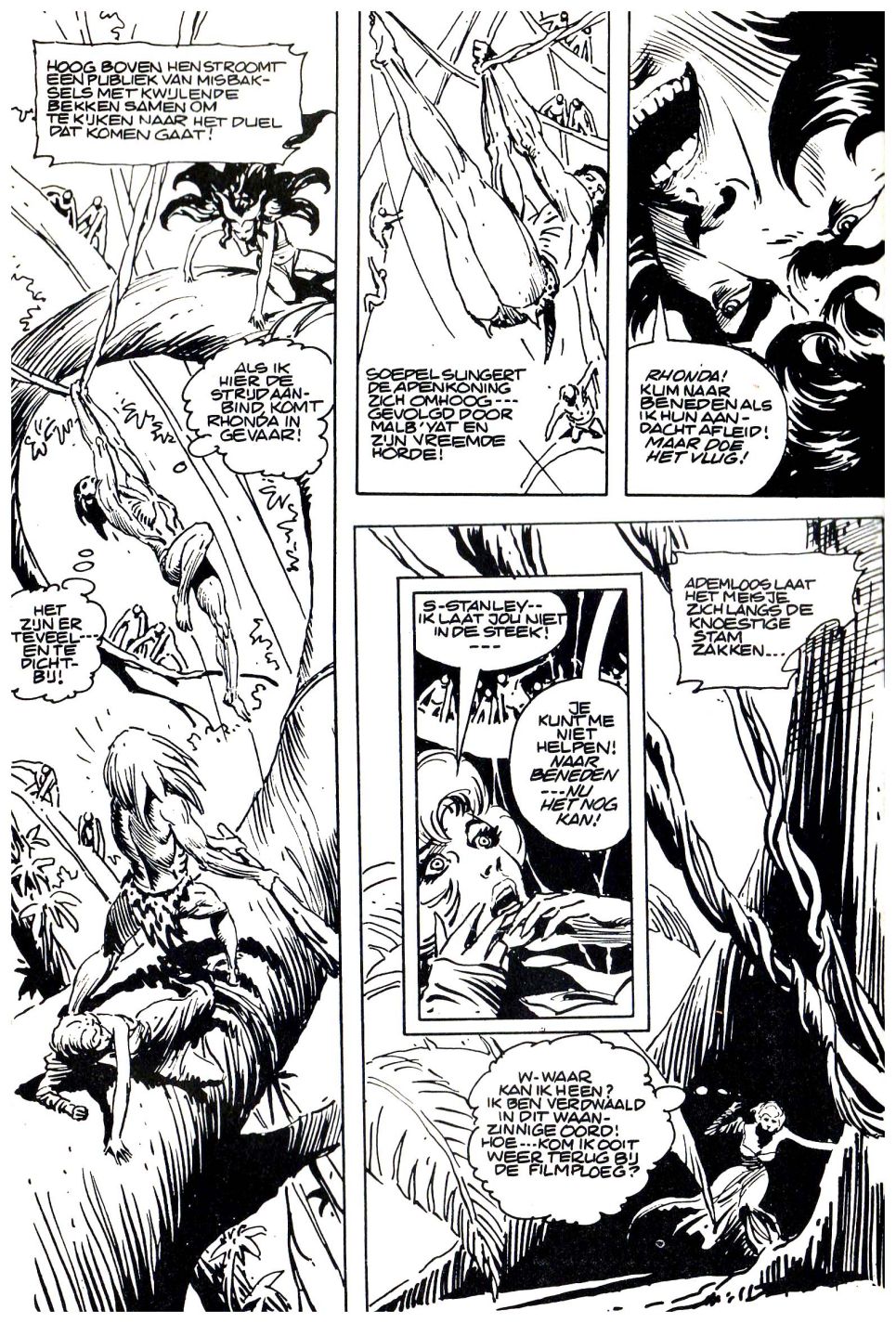 TE KIJKEN NAAR HET DUEL DAT KOMEN GAAT! ALS IK HIER DE STRIJD AANBIND, KOMT RHONDA IN GEVAAR! HET ZIJN ER TEVEEL... EN TE DICHTBIJ! SOEPEL SLINGERT DE APENKONING ZICH OMHOOG... GEVOLGD DOOR MALB'YAT EN ZIJN VREEMDE HORDE! RHONDA! KLIM NAAR BENEDEN ALS IK HUN AANDACHT AFLEID! MAAR DOE HET VLUG! S-STANLEY.. IK LAAT JOU NIET IN DE STEEK!... JE KUNT ME NIET HELPEN! NAAR BENEDEN... NU HET NOG KAN! ADEMLOOS LAAT HET MEISJE ZICH LANGS DE KNOESTIGE STAM ZAKKEN... W-WAAR KAN IK HEEN? IK BEN VERDWAALD IN DIT WAANZINNIGE OORD! HOE... KOM IK OOIT WEER TERUG BIJ DE FILMPLOEG? |