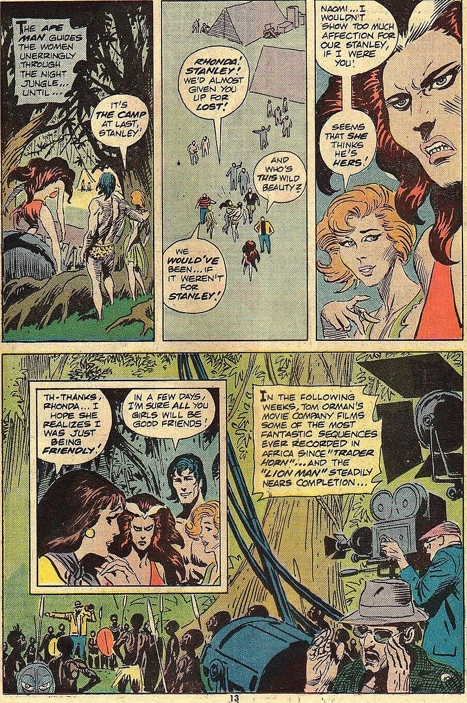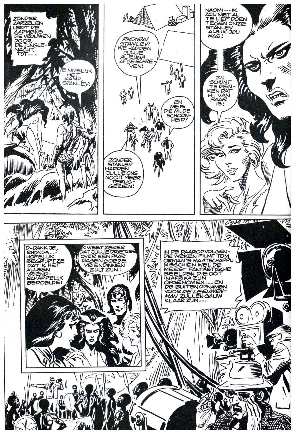 DE AAPMENS DE VROUWEN DOOR DE JUNGLE-NACHT, TOT... EINDELIJK HET KAMP, STANLEY! RHONDA! STANLEY! WE HADDEN JULLIE AL BIJNA AFGESCHREVEN! ZONDER STANLEY HADDEN JULLIE ONS NOOIT MEER TERUGGEZIEN! EN WIE IS DIE WILDE SCHOONHEID? NAOMI... IK ZOU NIET AL TE LIEF DOEN TEGEN ONZE STANLEY ALS IK JOU WAS! ZIJ SCHIJNT TE DENKEN DAT HIJ VAN HAAR IS! D-DANK JE, RHONDA... HOPELIJK BEGRIJPT ZE DAT IK HET ALLEEN VRIENDSCHAPPELIJK BEDOELDE! IK WEET ZEKER DAT JULLIE DRIETJES OVER EEN PAAR DAGEN GOEDE VRIENDINNEN ZULT ZIJN! IN DE DAAROPVOLGENDE WEKEN FILMT TOM ORMAN'S MAATSCHAPPIJ MISSCHIEN WEL DE MEEST FANTASTISCHE BEELDEN DIE OOIT IN AFRIKA ZIJN OPGENOMEN... EN DE BUITENOPNAMEN VOOR DE LEEUWENMAN ZULLEN GAUW KLAAR ZIJN... |