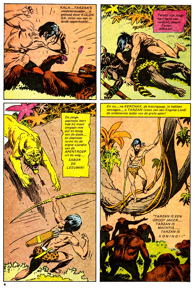 inlands opperhoofd.... Terwijl zijn jonge hart barst van verdriet, neemt Tarzan WRAAK De jonge aapmens leert hoe hij moet omgaan met pijl en boog van de dode.... en daarmee ruimt hij de ergste vijandin van de APENTROEP uit de weg..... SABOR DE LEEUWIN! En nu.... na KERCHAK, de koningsaap, te hebben verslagen.... is TARZAN (zoon van een Engelse Lord) de onbetwiste leider van de grote apen! "TARZAN IS EEN GROOT JAGER..... TARZAN IS MACHTIG... TARZAN IS KONING!!" |
